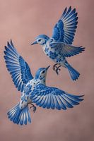 Twee gracieuze vogels lijken tot leven te komen in een luchtballet van Delfts blauw porselein, versierd met fijne florale motieven. De roze achtergrond versterkt hun delicate silhouetten en maakt dit werk een visueel gedicht vol elegantie.
