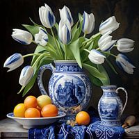 Een Delfts blauwe vaas en een bloemstilleven. Een afbeelding geïnspireerd op de historische en culturele elementen die in Nederland zijn geworteld.