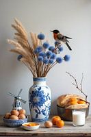 Een frisse en speelse weergave van een Hollands ontbijtstilleven in Delfts Blauwe stijl. De combinatie van een bloemrijke vaas, oranje accenten en een nostalgisch molentje maakt dit werk bijzonder geschikt voor landelijke keukens en interieurs met karakter.