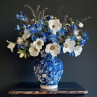 Afbeelding van delfts blauwe vaas met blauw witte bloemen op een zwart houten tafel. Heerlijk zomer en lentegevoel. Prachtig gestileerd op een donkere achtergrond, zodat het boeket volledig tot zijn recht komt. Passend bij diverse stijlen en trends. Artist: Bianca ter Riet. Stilleven.