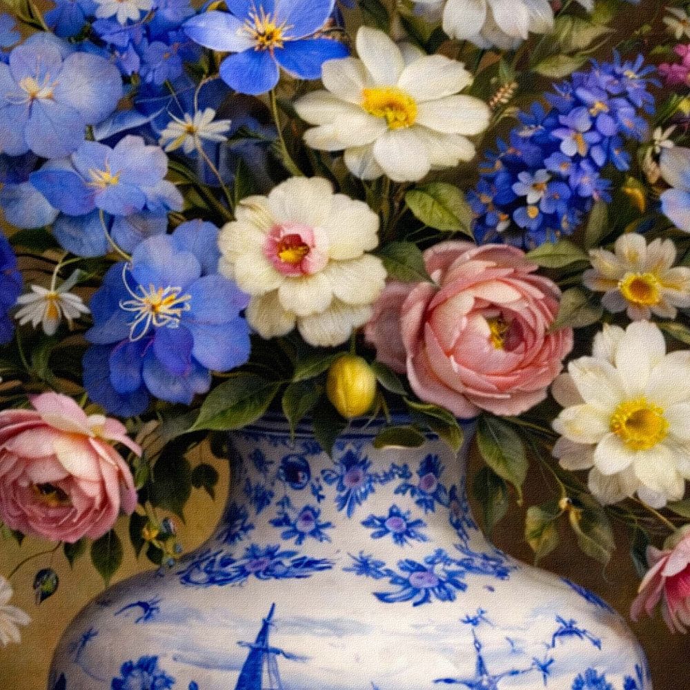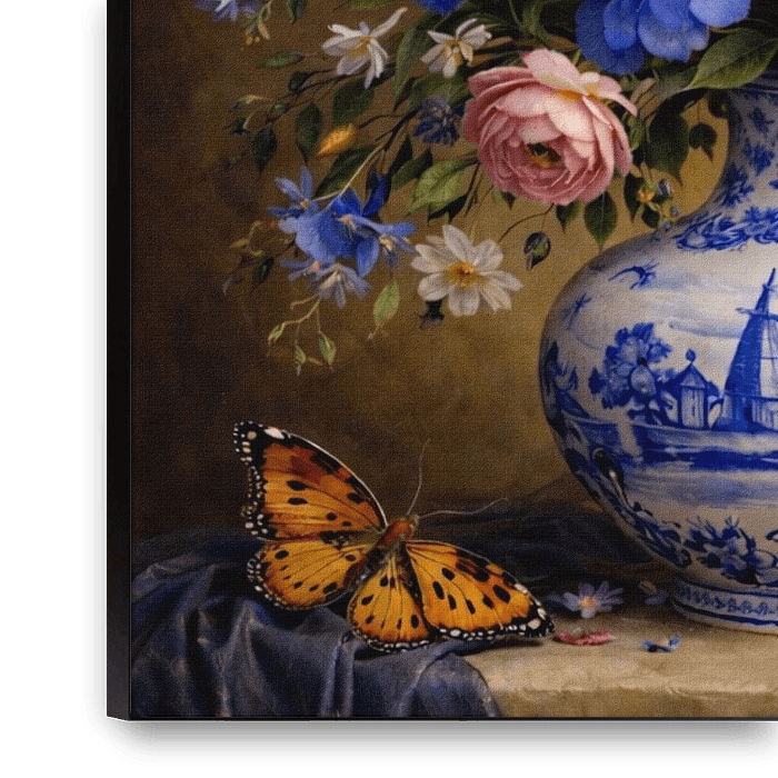 Delfts blauw stilleven met bloemen en vlinders.