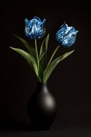 Twee prachtige delfts blauwe tulpen in een vaas, tegen een zwarte achtergrond. Hollands glorie in een klein stilleven.