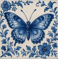 Op dit Delftsblauwe tegeltje prijkt een vlinder, vastgelegd in tijdloze eenvoud.