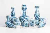 Stilleven met oud delft delftsblauwe vazen en parels tegen een witte achtergrond