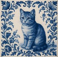 Op dit Delftsblauwe tegeltje prijkt een kat, vastgelegd in tijdloze eenvoud.