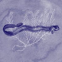 Vis in het delftsblauwe water, met daarachter zeewier. Op een aquarel achtergrond komt dit beeld mooi tot zijn recht.