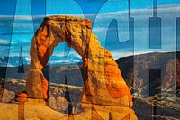 Delicate Arch bij zonsondergang, Arches National Park, Utah. Het woord ARCH als overlay op de afbeelding. (Ook zonder overlay te bestellen, zie mijn album VS of Nationale Parken).