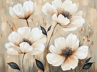 Delicate Dance of Nature - Dit bloemen schilderij toont grote, delicate witte bloemen met donkere, elegante stelen tegen een neutrale beige achtergrond, waardoor een serene en subtiele schoonheid wordt uitgestraald.