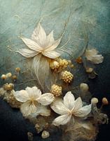 Een collage van delicate gedroogde bloemen in groen,ivoor en goud tinten.