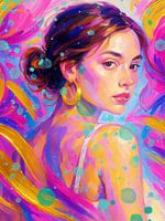 Dompel jezelf onder in een droomwereld met dit expressieve portret van een jonge vrouw, geschilderd in vloeiende streken van roze, goud en aqua. Haar bedachtzame blik, elegante oorbellen en zachte omgeving roepen een gevoel van kalmte en innerlijke kracht op. Dit kunstwerk mengt boho charme met moderne vrouwelijke energie - een perfect stuk om elke creatieve ruimte, slaapkamer of hedendaags interieur op te fleuren.