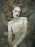 Abstract fantasie portret van een vrouw in voornamelijk beige en groene tinten.