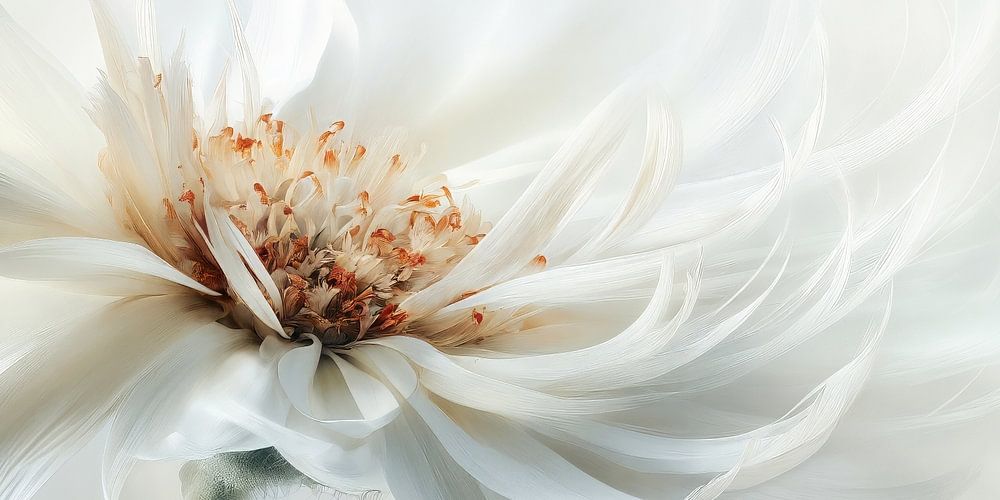 Een ethereal kunstwerk van een witte bloem, vastgelegd in een moment van pure gratie. De delicate bloemblaadjes lijken te dansen in een onzichtbare wind, waarbij ze vervagen in zachte, dromerige bewegingen. Het centrum van de bloem vormt een warm accent van goudbruine tinten, terwijl de ragfijne witte petalen als zijde vervloeien in de lichte achtergrond.