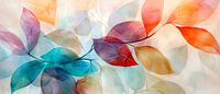 Zachte, doorschijnende bladeren in harmonieuze kleurtonen dansen samen en creëren een sfeer van lichtheid en rust. De delicate blauw-, oranje- en beigetinten geven de kamer een frisse elegantie die perfect is voor een zonovergoten keuken of een rustgevende slaapkamer. Een waar feest van de natuur voor je muren!