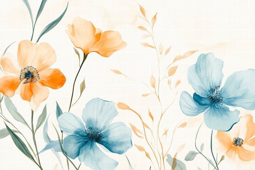 Zachte pasteltinten ontvouwen zich in een harmonieus samenspel van bloeiende aquarelbloemen. De tere bladeren omlijsten de zachte bloesems in oranje en blauw en creëren een uitnodigende en frisse sfeer. Dit kunstwerk voegt een vleugje natuur en rust toe aan elke slaapkamer of woonkamer, perfect voor ontspannende momenten.
