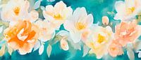 Een zee van zachte pastelkleuren ontvouwt zich, terwijl weelderige bloemen schitteren in bloeiende pracht. De delicate nuances van wit, perzik en abrikoos harmoniëren perfect met een kalmerend aquablauw en creëren een sfeer van lentefrisheid. Dit kunstwerk komt bijzonder mooi tot bloei in een uitnodigende woonkamer, waar het zachte charme uitstraalt.