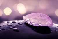 Zachte pasteltinten en delicate waterdruppels geven de compositie een rustgevende elegantie. Een enkel paars blad zweeft harmonieus op een gladde steen en brengt een vleugje natuur in de kamer. Dit kunstwerk is ideaal voor de slaapkamer en creëert een ontspannen sfeer en nodigt uit tot rust en meditatie.