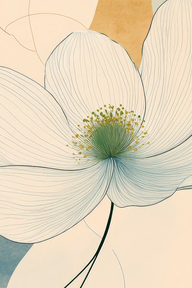 Zachte elegantie ontvouwt zich in delicate lijnen en een eenvoudig kleurenspel. De bloeiende bloem straalt vrede en harmonie uit, terwijl de gebogen vormen de vrijheid van de natuur weergeven. Dit kunstwerk brengt een verfrissende toets in elke woonkamer en creëert een uitnodigende en ontspannen sfeer. Ideaal voor momenten van bezinning…
