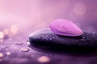 Zachte paarse tinten omhullen een delicaat bloemblaadje dat rust op een gladde, zwarte steen. De reflecterende waterdruppels geven de compositie een ontspannen sfeer die doet denken aan kalmte en sereniteit. Dit kunstwerk is perfect voor de slaapkamer of een meditatieruimte en wordt een oase van rust in je kamer.