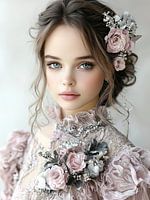 Deze foto toont een jonge vrouw die betovert met haar gracieuze aanwezigheid en delicate elegantie. Haar gave huid, gecombineerd met de zachte contouren van haar gezicht, doet denken aan de puurheid van een bloem in volle bloei. Haar expressieve blauwe ogen lijken een verhaal te vertellen, alsof ze diep in de ziel van de toeschouwer kijken. De delicate bloemstukken die haar haar sieren versterken de indruk van kwetsbaarheid en schoonheid, terwijl de zachte pasteltinten van haar kleding harmoniëren met de bloemmotieven.