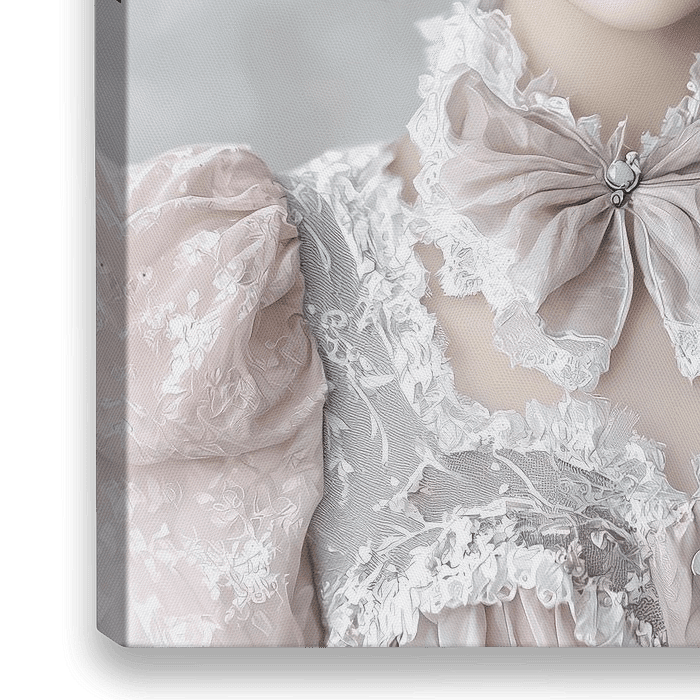 Het schilderij toont een jong meisje gekleed in een romantisch geïnspireerde, delicate jurk. De pastelroze tinten van de stof vloeien zachtjes rond haar delicate lichaam, terwijl de fijne kanten versieringen de jurk met een subtiele elegantie versieren. Haar gezicht straalt puurheid en kalmte uit, gevangen in een moment van stille…