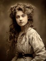 Dit portret toont een jonge vrouw die schittert in een zacht, gouden licht en een bijna etherische gratie uitstraalt. Haar gezicht is zacht verlicht en haar kalme, bedachtzame blik trekt de kijker mee in een stille dialoog. De zachte golven van haar lange, volumineuze haar omlijsten haar gezicht en benadrukken haar natuurlijke schoonheid, die wordt onderstreept door haar eenvoudige maar elegante jurk.
