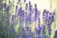 Gevoelige bloemen en de geur van lavendel. Hier in een helder vriendelijk groen als achtergrond, met de tedere pastelkleuren van lavendel. Betoverende foto voor wanddecoratie in uw huis.