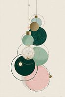 Dit kunstwerk bestaat uit een verfijnde opstelling van moderne kerstballen, geïllustreerd door overlappende cirkels, zachte texturen en elegante gouden details. De kerstballen zweven verticaal in een evenwichtige compositie, een combinatie van diep smaragdgroen, zachte minttinten, warm goud en zacht blushroze. Delicate stippellijnen,…