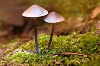 Delicate, delicate paddenstoelen op de bosgrond. Dennennaalden en mos op de grond. Paddenstoelen zijn bijgesneden, met bokeh.