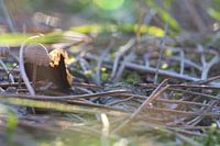Delicate, delicate paddenstoelen op de bosgrond. Dennennaalden en mos op de grond. Paddenstoelen zijn bijgesneden, met bokeh.