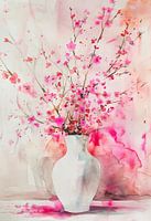 Aquarel van roze kersenbloesems in een witte vaas. Nat geschilderd met watertechniek en spatten. Diverse tinten roos. Impressionistisch geschilderd. Naast roze is er ook gebruik gemaatk van bruin, beige en oranje. Passend bij diverses stijlen en trends, waaronder pastel, bloemen. Artist: Bianca ter Riet