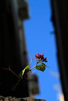 Een delicaat plantje groeit op een muur, gezien tegen de blauwe lucht