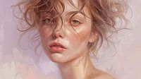 Een verfijnd portret van een jonge vrouw wiens krullende lokken haar gezicht omlijsten. De zachte pastelkleuren en de schilderachtige lichtreflecties geven het tafereel een dromerige, bijna intieme sfeer. Een kunstwerk vol emotie en elegantie.