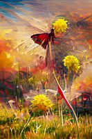 De weiden in de lente zijn prachtig om naar te kijken met hun weelderig fris groen en de vele spatten geel. Dit abstracte schilderij van bloeiende paardebloemen op een weiland en een vlinder die in het warme licht van het avondrood een paardebloembloesem bezoekt om misschien van het laatste slokje nectar van de dag te genieten, is hierop geïnspireerd. Sterke rode, oranje en gele tinten creëren een gevoel van warmte bij de toeschouwer naarmate hij meer en meer in de details van dit ondoorgrondelijke kunstwerk kijkt.