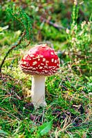 Delicate witrode paddenstoel, donzig en dromerig, groeiend op de bosbodem. Giftige paddenstoel. Rode hoed met witte vlekken. Close-up van de natuur in het roze bos.