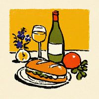 Delight in Every Bite - Dit is een voedsel schilderij met een smakelijke sandwich op een bord, een glas witte wijn en een groene wijnfles, alles tegen een vrolijke gele achtergrond die het geheel een frisse uitstraling geeft.