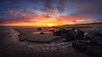 Een panorama van de kust bij Vlissingen tijdens een spectaculaire zonsondergang, waarbij de lucht vervult van rijke kleuren.