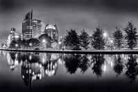 De skyline van Den Haag, gezien vanaf het Malieveld in zwart/wit
