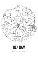 Zwart-witte landkaart, stratenplan of plattegrond van Den Ham. Den Ham is gelegen in Twente, in de gemeente Twenterand, provincie Overijssel. Op de stadskaart zijn alle openbare wegen in Den Ham opgenomen. Verder is de kaart voorzien van de coördinaten van het centrum van Den Ham.