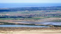 Het dorpje Den Hoorn op Texel met het markante witte kerkje, hoog gezien vanaf de Razende Bol richting het dorp De Koog. Op de voorgrond de baai De Mok.