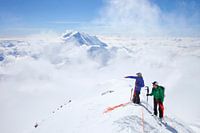 Twee alpinisten kijken uit over de woeste bergen van Alaska. Ze staan op de Denali Westrib, een graat op deze hoogste berg van Amerika.