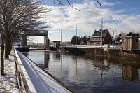 Zicht op de Dender en de Denderbelle Sluis op een besneeuwde winterochtend. De 'Sluis' is een bootsluis bij Dendermonde in Oost-Vlaanderen, België. Landschapsfotografie van de Dendervallei in Denderland of Denderstreek.