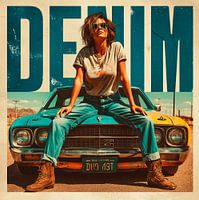 Een kunstwerk van een vrouw in een vervaagd T-shirt en een Denim spijkerbroek die zelfverzekerd op de motorkap van een oldtimer zit, die een verweerde geel-blauwe laklaag heeft. Ze draagt een piloten zonnebril en bruine laarzen en heeft warrig haar. De achtergrond toont een kaal landschap, de algehele sfeer roept een gevoel van avontuur en vrijheid op