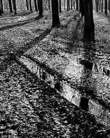 Tegenlicht opname van bospad met na regen volgelopen bandensporen. Ik moet daarbij denken aan een werk van M.C. Escher getiteld ?Modderplas?.
