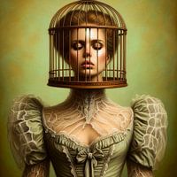 Wat een bijzondere portretten van vrouwen met een vogelkooi, wat is hier aan de hand? vrouwen in victoriaanse jurken, met een verdwaasde blik, die een vogelkooi op hun hoofd hebben, of waarbij het lijkt of ze er net van bevrijd zijn.