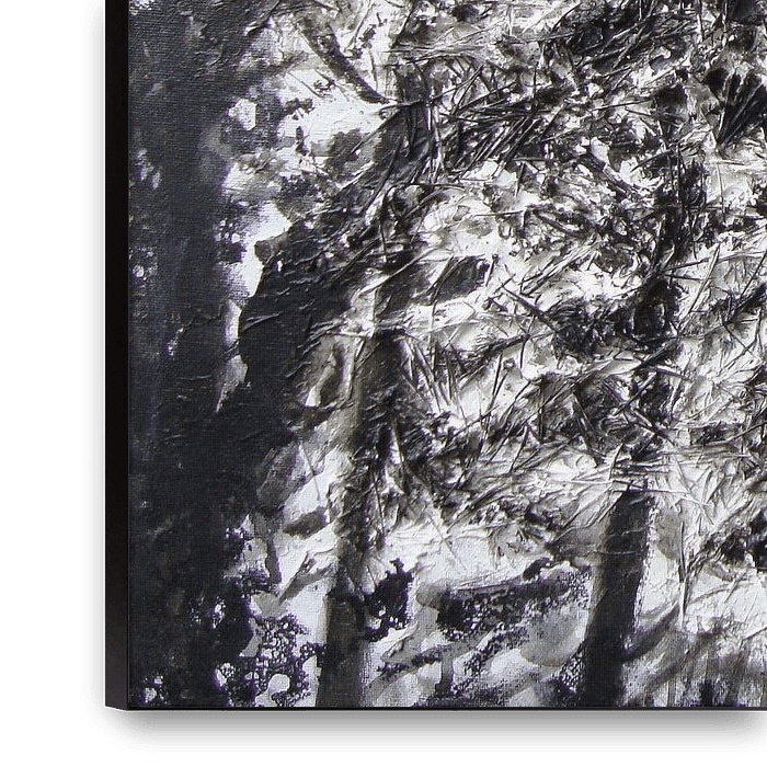 Zwart-wit expresionistische weergave van een dennebos.Acrylverf met verdikkingspasta en dennenaalden.