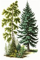 Een fijn weergegeven digitale illustratie met twee verschillende bomen: een hoge, majestueuze den en een kortere spar met fijne, compacte takken. De scène tegen een schone witte achtergrond heeft heldergroen gebladerte en delicate gele bloemen verspreid over de bosgrond voor de dennenboom. Het kunstwerk heeft realistische texturen en ingewikkelde details in de schors, naalden en grondelementen, en biedt een naturalistische en serene bosesthetiek - perfect voor educatieve, decoratieve of botanische ontwerpprojecten.