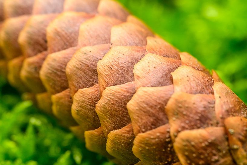 Dennenappel en frisgroen mos op de bosbodem. Macrofotografie foto in natuurgebied de Veluwe tijdens een herfstdag.