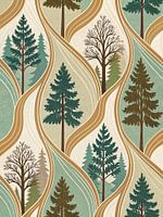 Stap terug in de tijd met deze charmante retro art print, met een stijlvolle mid-century moderne esthetiek. Dit ontwerp toont een repeterend patroon van gestileerde dennen- en espenbomen genesteld in vloeiende, organische vormen. Het rijke kleurenpalet van diep woudgroen, aardebruin en warme goudtinten roept een knus, nostalgisch gevoel…