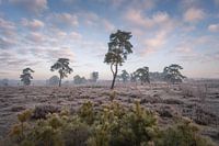 Een winterse ochtend op de heide. Na een nachtje vorst is het landschap bedekt met een laagje rijp. De dennen in de voorgrond nemen je zo mee de natuur in. De heide, bomen en schapenwollen maken het beeld compleet. Met deze foto van dennenbomen en sparren haal je de Veluwe in huis.