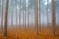 De stammen van dennebomen in het bos op een mistige dag, met herfstbladeren op de grond in natuurgebied De Teut in Zonhoven (België)